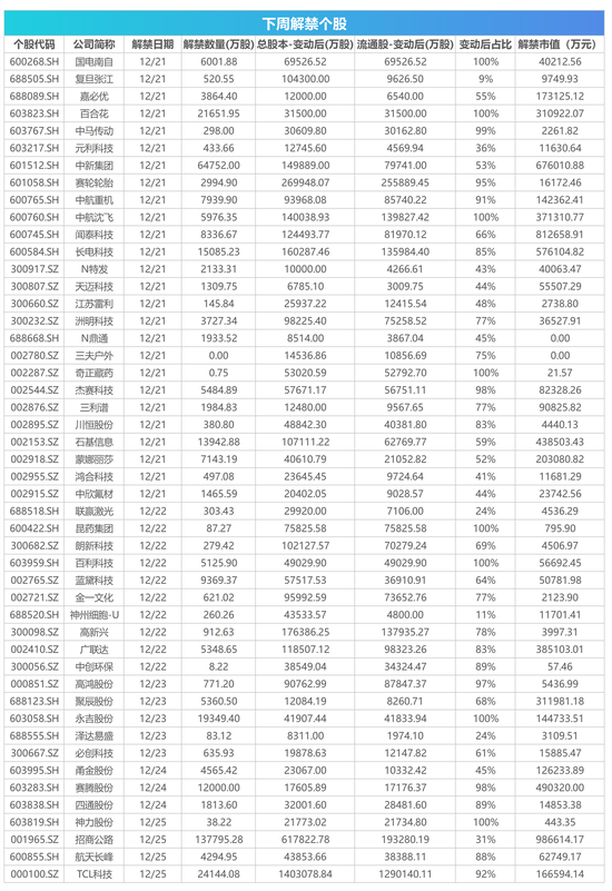 Wind数据统计显示,下周(12月21日-12月25日)共有47家公司限售股陆续解禁,合计解禁量41.12亿股,按12月18日收盘价计算,解禁市值为694.12亿元,较本周解禁市值1446.66亿元下降52.02%。从解禁市值来看,12月21日是解禁高峰期,24家公司解禁市值合计409.17亿元,占下周解禁规模58.95%。按12月18日收盘价计算,解禁市值居前三位的是:招商公路(98.66亿元)、闻泰科技(81.27亿元)、中新集团(67.6亿元)。从个股的解禁量看,解禁股数居前三位的是:招商公路(13.78亿股)、中新集团(6.48亿股)、TCL科技(2.41亿股)。