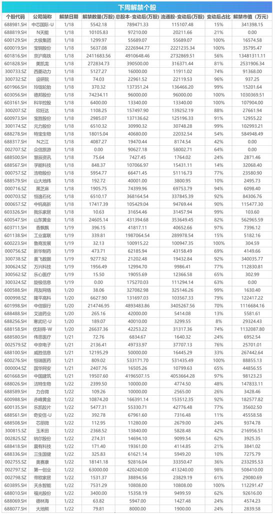 下周有63股解禁,合计解禁市值飙升至2400亿元。Wind数据显示,下周(1月18日至22日),沪深两市限售股上市数量合计326.34亿股,以1月15日收盘价计算,市值约2407.34亿元,分别较本周环比大增了468%、291%。下周共有63股解禁,解禁数量较大的公司有京沪高铁、美凯龙、中信银行、德邦股份、第一创业等。