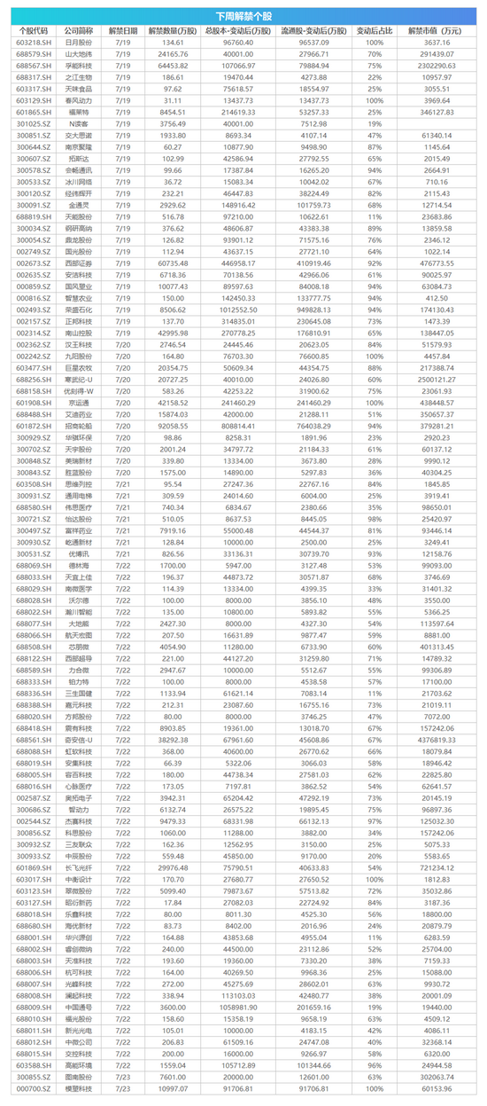 Wind数据统计显示,下周共有91家公司限售股陆续解禁,合计解禁量59.05亿股,按7月16日收盘价计算,解禁市值为1549.18亿元,较本周解禁市值1023.56亿元上升51.35%。从解禁市值来看,7月22日是解禁高峰期,44家公司解禁市值合计678.29亿元,占下周解禁规模43.78%。按7月16日收盘价计算,解禁市值居前三位的是:奇安信(437.68亿元)、寒武纪(250.01亿元)、孚能科技(230.23亿元)。从个股的解禁量看,解禁股数居前三位的是:招商轮船(9.21亿股)、孚能科技(6.45亿股)、西部证券(6.07亿股)。