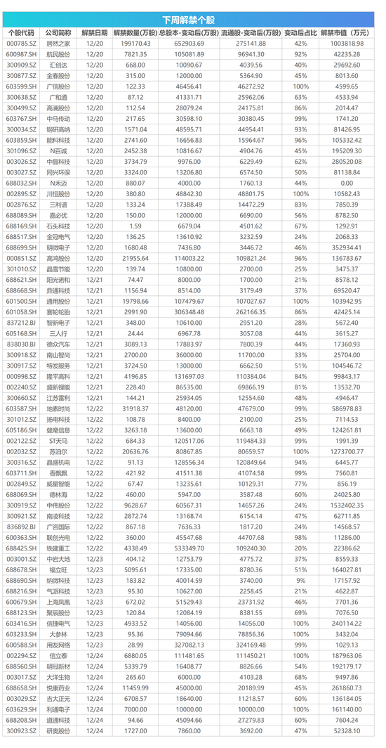 下周781亿市值限售股解禁,三家公司解禁超百亿。Wind数据统计显示,下周(12月20日-12月24日)共有65家公司限售股陆续解禁,合计解禁量41.31亿股,按12月17日收盘价计算,解禁市值为780.73亿元。从解禁市值来看,12月22日是解禁高峰期,14家公司解禁市值合计367.63亿元,占下周解禁规模47.09%。按12月17日收盘价计算,解禁市值居前三位的是:中伟股份(153.24亿元)、苏泊尔(127.37亿元)、居然之家(100.38亿元)。从个股的解禁量看,解禁股数居前三位的是:居然之家(19.92亿股)、地素时尚(3.19亿股)、高鸿股份(2.2亿股)。