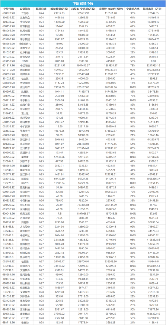 逾1900亿元市值限售股下周解禁。Wind数据统计显示,下周(1月24日-1月28日)共有72家公司限售股陆续解禁,合计解禁量75.05亿股,按1月21日收盘价计算,解禁市值为1947.35亿元。从解禁市值来看,1月24日是解禁高峰期,33家公司解禁市值合计701.68亿元,占下周解禁规模36.03%。按1月21日收盘价计算,解禁市值居前三位的是:康龙化成(463.64亿元)、贝特瑞(419.88亿元)、中远海控(221.8亿元)。从个股的解禁量看,解禁股数居前三位的是:中远海控(13.28亿股)、信达地产(7.97亿股)、新乳业(6.94亿股)。