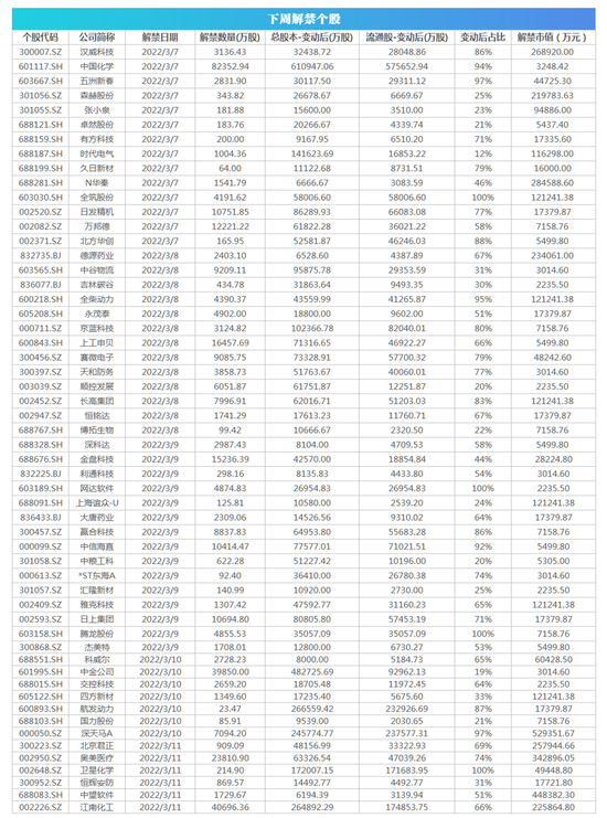 下周424.75亿市值限售股解禁。下周(3月7日-3月11日)共有55家公司限售股陆续解禁,合计解禁量37.5亿股,按3月4日收盘价计算,解禁市值约为424.75亿元。个股解禁中,深天马A、中望软件、奥美医疗解禁市值较大,分别为52.9亿元、44.8亿元、34.3亿元。