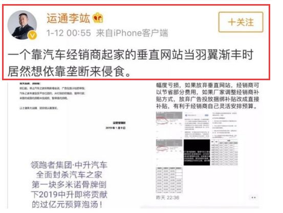 其中,通汽车集团总裁李竑更是在1月12日的微博里直接和汽车之家叫上了板。