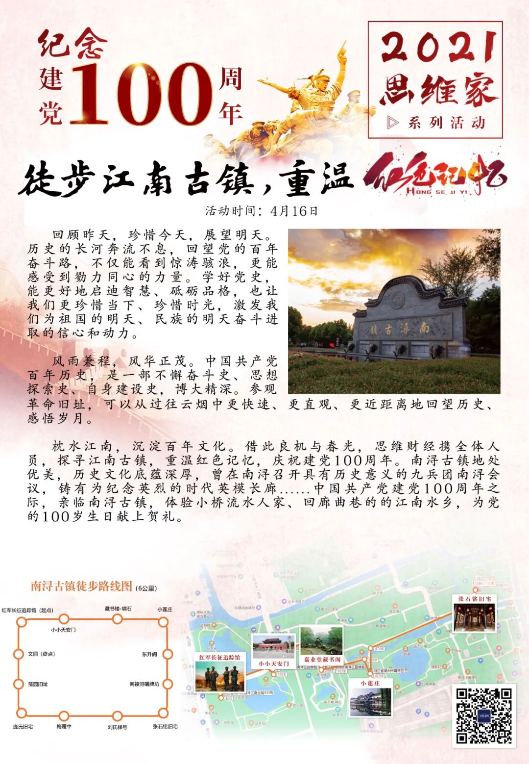 枕水江南,沉淀百年文化。借此良机与春光,思维财经携全体人员,探寻江南古镇,重温红色记忆,庆祝建党100周年。南浔古镇地处优美,历史文化底蕴深厚,曾在南浔召开具有历史意义的九兵团南浔会议,铸有为纪念英烈的时代英模长廊......中国共产党建党100周年之际,亲临南浔古镇,体验小桥流水人家、回廊曲巷的的江南水乡,为党的100岁生日献上贺礼。
