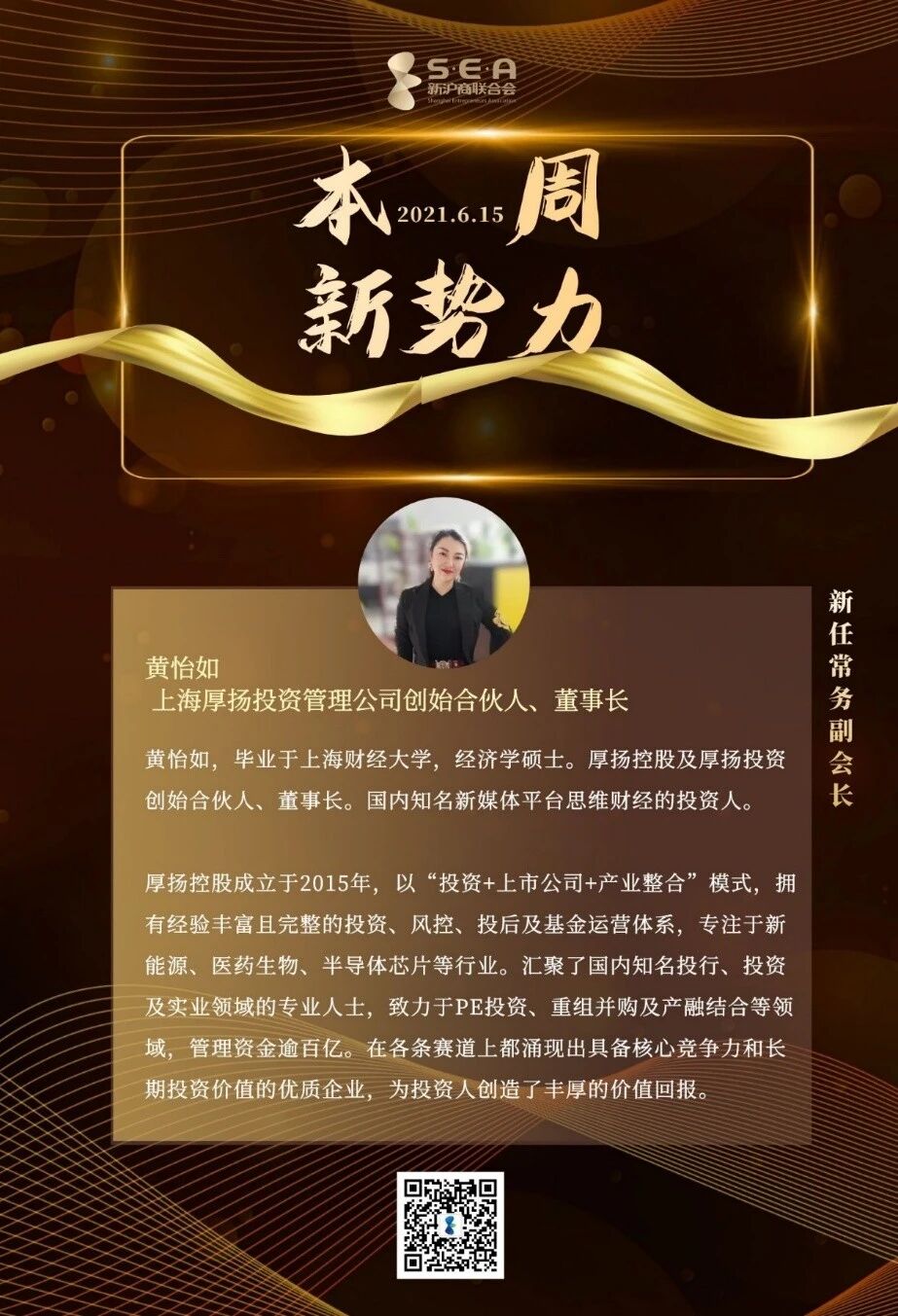 6月15日,上海厚扬投资管理有限公司(简称“厚扬投资”)创始合伙人、董事长黄怡如当选上海新沪商联合会的常务副会长。新沪商联合会作为中国最具影响力的企业家联合会平台,拥有市值超过百亿的商界精英上百人,在中国政治、经济、社会舞台上发挥着举足轻重的作用。上海这片土地上,一直以来人才辈出,引领着中国经济的蓬勃发展,企业家精神也赋予了新沪商联合会超乎寻常的商业格局和社会影响力。