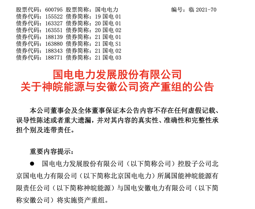 事件经过:《国电电力发展股份有限公司关于神皖能源与安徽公司资产重组的公告》表示,国电电力控股子公司北京国电电力所属国能神皖能源有限责任公司与国电安徽电力有限公司将实施资产重组。