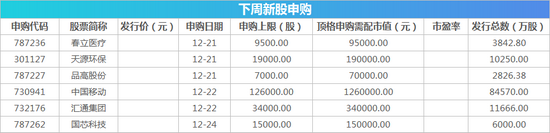 下周将有6只新股发行。Wind数据统计显示,下周将有6只新股发行。12月21日发行的是春立医疗、品高股份、天源环保;12月22日发行的是汇通集团、中国移动;12月24日发行的是国芯科技。这6只新股累计发行数量共计约11.92亿股,预计募集资金金额共计609.91亿元。其中,中国移动本次拟公开发行人民币股份数量不超过9.65亿股并在上交所主板上市,发行比例不超过发行后总股本的4.50%;拟募资560亿元。据了解,这一规模将超过中国电信(4.350, -0.01, -0.23%)的544亿元,成为近10年来A股最大规模IPO。公开资料显示,中国移动分别于1997年10月先后在美股和港股上市,去年5月18日自纽交所退市。美股退市三个月后,公司向证监会提交A股上市申请。自此,三大运营商终于在“大A”聚首。