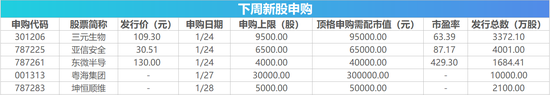 下周迎来5只新股申购,按所属板块,科创板有3只、创业板有1只,深市主板有1只。日程安排上,下周一可申购三元生物、亚信安全、东微半导,下周四可申购粤海集团,下周五可申购坤恒顺维。