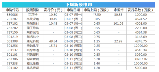 Wind数据统计显示,下周(3月7日至3月11日)将有13只新股发行。3月7日发行的是格灵深瞳、斯瑞新材、克莱特(北交所);3月8日发行的是理工导航、莱特光电、腾远钴业、康冠科技;3月10日发行的是华融化学、哈焊华通、何氏眼科;3月11日发行的是均普智能、和元生物、兆讯传媒。这13只新股累计发行数量共计约为8.87亿股,预计募集资金金额共计120.88亿元。此外,下周将有2只新股首发上市,3月7日上市的是华秦科技、华是科技。