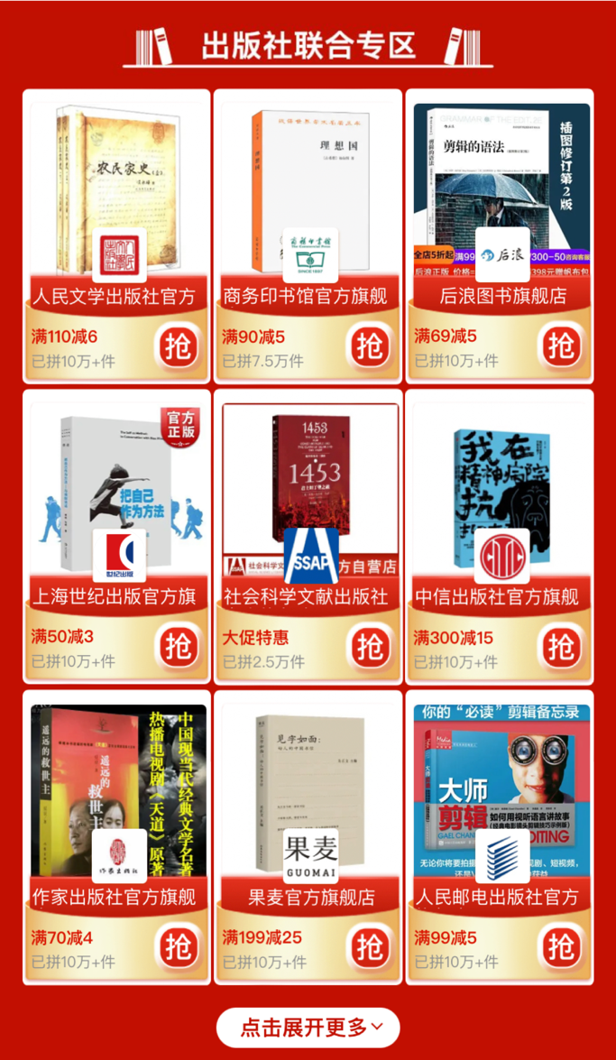 第三季“多多读书月”活动设立出版社联合专区,人民文学出版社、商务印书馆、中信出版社等上百家国内主流出版社、图书出版公司官方旗舰店一键直通