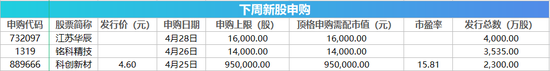 Wind数据统计显示,下周将有3只新股发行。4月25日发行的是科创新材,4月26日发行的是铭科精技,4月28日发行的是江苏华辰。这3只新股累计发行数量共计约0.98亿股,预计募集资金金额共计9.96亿元。此外,下周将有1只新股首发上市,4月25日上市的是药康生物。
