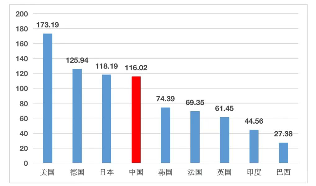 如何衡量一国制造业的强弱?如何衡量中国的制造强国建设进程?中国工程院每年都发布一次制造强国建设指数。总体说来,这几年指数的变化不是很大。世界制造业强国排序基本是四个阵营。第一阵营是美国,遥遥领先;第二阵营是德国和日本,伯仲之间;第三阵营是中国、韩国、法国、英国。中国的指数116,和第二阵营的日本差两个点,比第三阵营排我们后面的韩国高50点左右;第四阵营就是印度、巴西、阿根廷等国家。