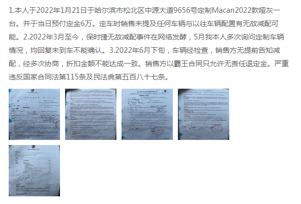 关于保时捷减配,目前仍持续遭遇消费者投诉。今年7月,有消费者在黑猫投诉平台投诉“保时捷减配,霸王条款”、“严重违反国家合同法”。