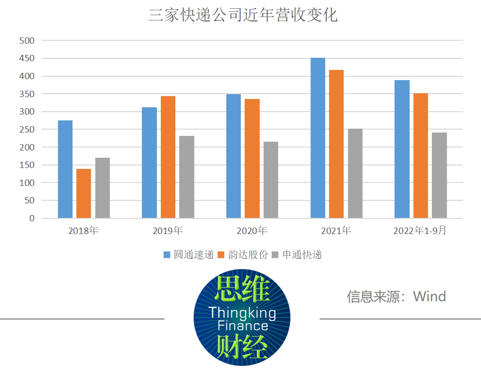 这样的表现在同行业中稍显平庸,从申通、韵达、顺丰所发布的相关数据来看,申通速递快递收入增长最快,同期收入约30亿元,同比增长近30%。
