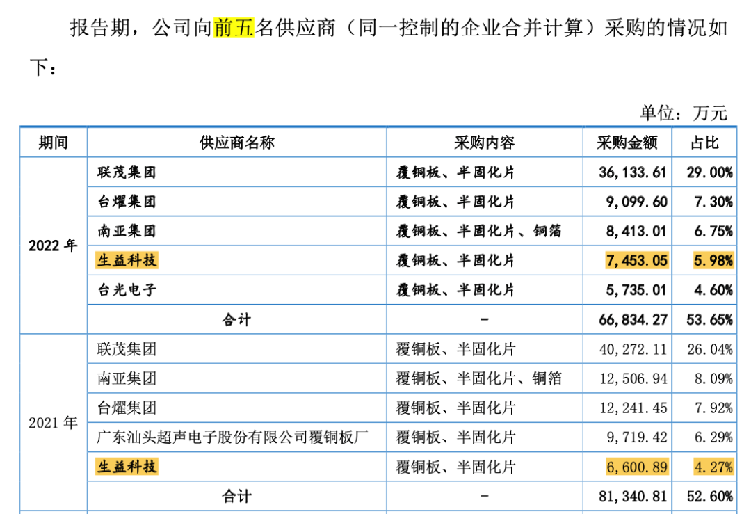 2021、2022年,广合科技向生益电子采买覆铜板、半固化片,采购金额分别为6600.89万元和7453.05万元,占比4.27%和5.98%,分列当年第五、第四名供应商。
