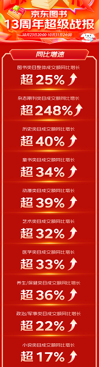 京东图书发布的数据显示,京东11.11首周,图书类目整体成交额同比增长超25%。其中,杂志期刊类目成交额同比增长超248%,历史类目成交额同比增长超40%,动漫类目成交额同比增长超39%,养生/保健、童书、医学、艺术、政治/军事、小说等类目成交额也实现了快速增长。