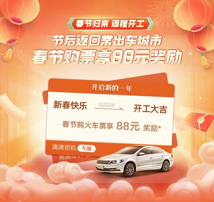 为了方便司机师傅返乡和返工,在北京、杭州、深圳、武汉、成都、苏州、上海、太原、大连等城市,滴滴推出了针对司机的春节车票奖励活动,最高可享88元福利奖励。司机师傅可在滴滴车主App报名参与活动领取,在1月29日-2月6日期间使用“滴滴出行”用户端app购买火车票,即可享受28元优惠减免,同时参与活动的司机师傅,在返工后还可获得最高60元的活跃营任务奖励。部分城市的司机师傅,还可组队参与新春团队PK赛,与小队成员一起领取最高1088元的奖金。