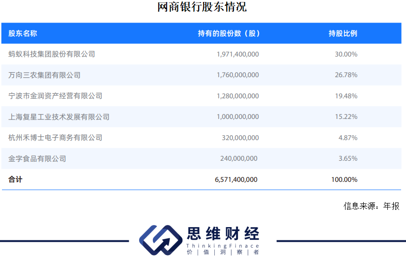 民生人寿受让万向三农持有的网商银行股份之前,万向三农持有网商银行26.78%股份,是该行第二大股东,股份转让之后,万向三农的股权比例将下降至15.82%,成为网商银行第三大股东,而民生人寿将成为网商银行第五大股东。