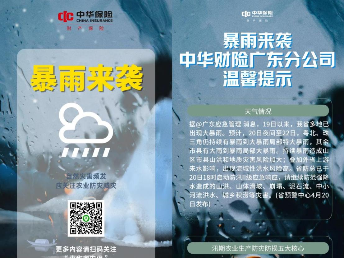 在佛山,中华财险佛山中心支公司多渠道发布暴雨预警信息,协助56户种植户排查1317亩水稻、70余亩玉米地,派发防汛防灾操作指南,协助农田排水清沟。在湛江,中华财险湛江中心支公司紧急联合杨家镇人民政府为农户捐赠3吨生物化肥,提升农户风险抵御能力。