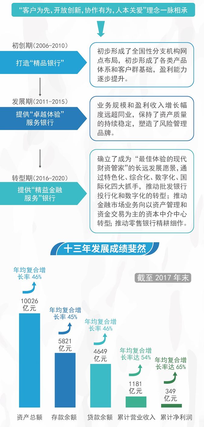 成立13年来,渤海银行先后完成了“一五”和“二五”规划,正在实施“三五”规划。据了解,在2006-2010年的初创期,渤海银行初步形成了全国性分支机构网点布局,形成了各类产品体系和客户群基础,各项业务规模迅速增长,开业次年即实现盈利。在2011-2015年的发展期,业务规模和盈利收入增长幅度远超同业,保持了资产质量的持续稳定,塑造了“风险管理”品牌形象。在2016年-2020年的转型期,渤海银行继续承袭一贯的经营理念和企业文化理念,确立成为“最佳体验的现代财资管家”长期愿景,通过特色化、综合化、数字化、国际化四大抓手,持续推动批发银行投行化和数字化的转型,推动金融市场业务向以资产管理和资金交易为主的资本中介中心转型;推动零售银行以“压力一代”、“养老一族”为特色业务模式的精耕细作。