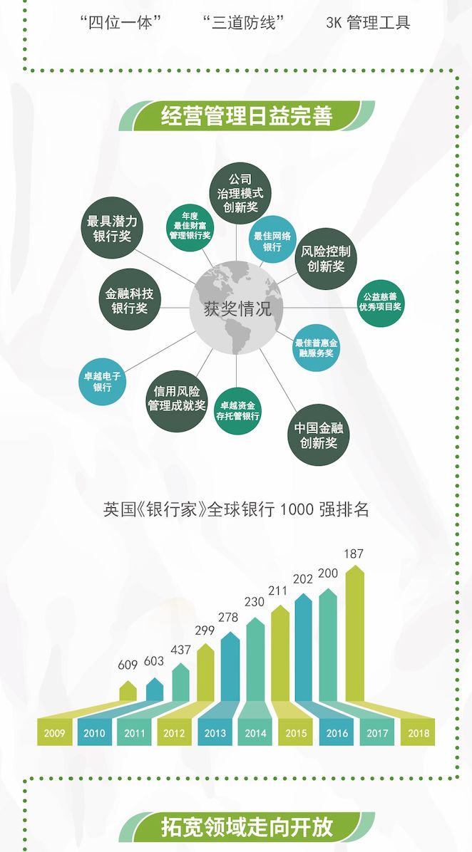 截至2017年末,渤海银行资产总额达到10026亿元,存款余额5821亿元,贷款余额4649亿元,自开业首年(2006年)至2017年末,这三项指标的年均复合增长率分别达46%、45%和46%。截至2017年累计实现营业收入1181亿元,年均复合增长率达54%;累计实现净利润349亿元,年均复合增长率达65%。目前已在全国设立了30家一级分行、27家二级分行,分支机构网点总数达到248家,在香港设立了代表处,在上海、天津、深圳前海和厦门设立了自贸区分行。获得了包括“公司治理模式创新奖”、“风险控制创新奖”、 “信用风险管理成就奖”、“金融科技银行奖”在内的多项殊荣。在英国《银行家》杂志发布的全球银行1000强排名中,由初创期的609位上升为2018年的187位,提升了422名。