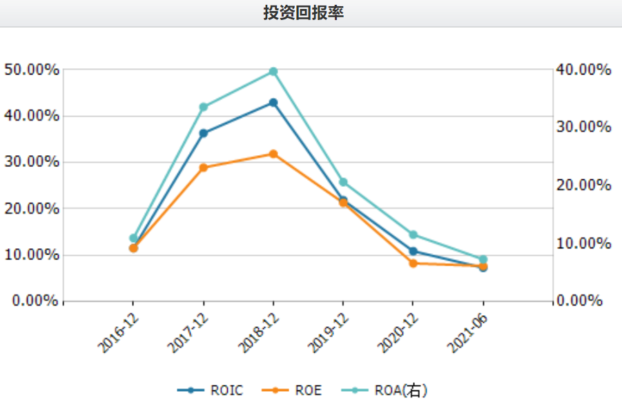 若从投资回报率来看,公司近几年每股收益均保持在0.63元/股左右,但净资产收益率(加权)有所下滑,2018年至2020年分别为41.76%、22.2%、9.62%,今年上半年为7.9%。