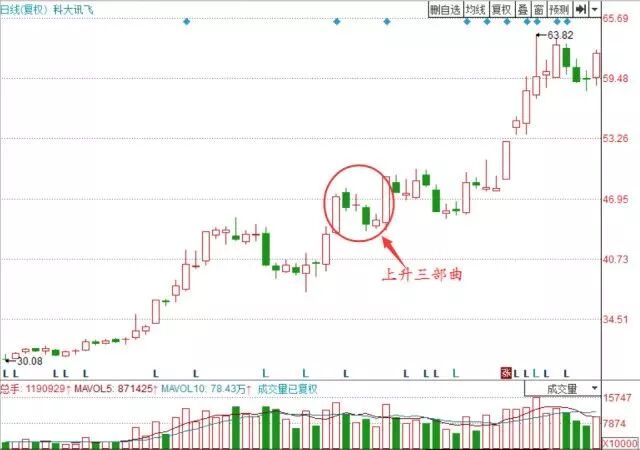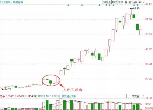 3.典型的上升三部曲(即中间3根为阴线)出现的概率较小,主要出现在上涨过程中。